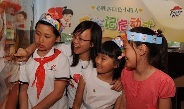 京城首家“必勝客綠色小超人主題餐廳”近日正式揭幕。大學(xué)生志愿者們帶領(lǐng)來自呼家樓小學(xué)的首批“必勝客綠色小超人”在這里開始了一場“畫手絹游戲”。