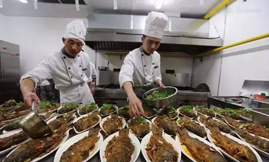 餐廳中,丁司務長正抱著一桶水往餐臺里倒,記者急忙走上去幫忙,原來他是在準備飯菜的保溫工作。5時40分,4道菜已經(jīng)擺放到加熱好的餐臺上。