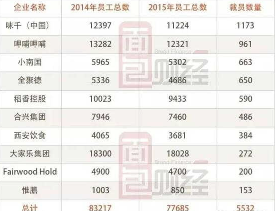 面包財經翻查了港股與A股餐飲類上市公司財報發現,大部分餐飲公司在2015年均采取了較為明顯的裁員措施。下圖為面包財經整理的在A股和港股上市餐飲企業員工數變化圖:上述10家餐飲企業裁員人數為5532人,裁員率為6%;其中味千員工數量減少最多,較上年減少1173名;全聚德員工減少比例則高達12%。